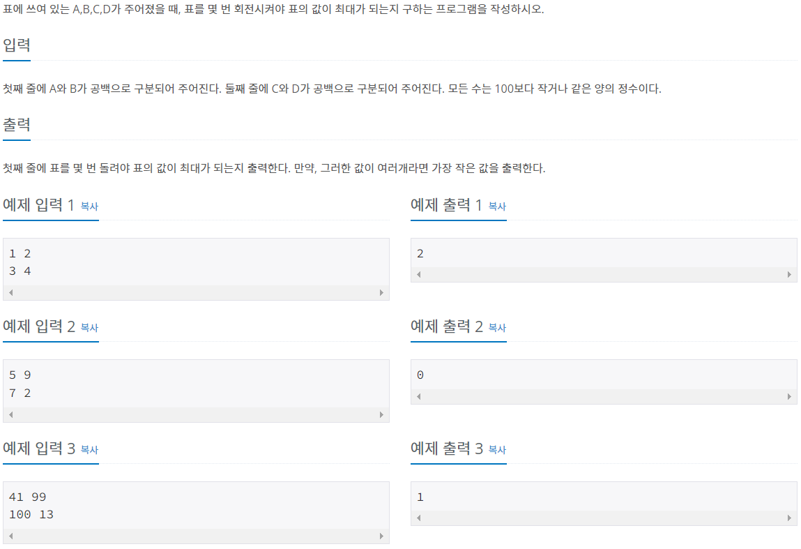 import java.io.BufferedReader; import java.io.IOException; import java.io.InputStreamReader; import java.util.StringTokenizer; public class Main { public static void main(String[] args) throws IOException { BufferedReader br = new BufferedReader(new InputStreamReader(System.in)); double[] arr = new double[4]; StringTokenizer st = new StringTokenizer(br.readLine()); double A = Double.parseDouble(st.nextToken()); double B = Double.parseDouble(st.nextToken()); st = new StringTokenizer(br.readLine()); double C = Double.parseDouble(st.nextToken()); double D = Double.parseDouble(st.nextToken()); //처음은 0이고 총 3번까지 돌리니 인덱스 값 3까지 계산한다. arr[0] = (A / C) + (B / D); arr[1] = (C / D) + (A / B); arr[2] = (D / B) + (C / A); arr[3] = (B / A) + (D / C); double max = 0; int N = 0; for(int i = 0; i < 4; i++) { if(max < arr[i]) { max = arr[i]; N = i; } } System.out.println(N); } }