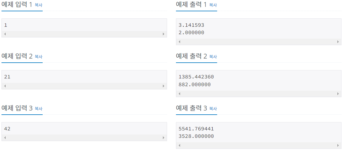첫째 줄에는 유클리드 기하학에서 반지름이 R인 원의 넓이를, 둘째 줄에는 택시 기하학에서 반지름이 R인 원의 넓이를 출력한다. 정답과의 오차는 0.0001까지 허용한다.