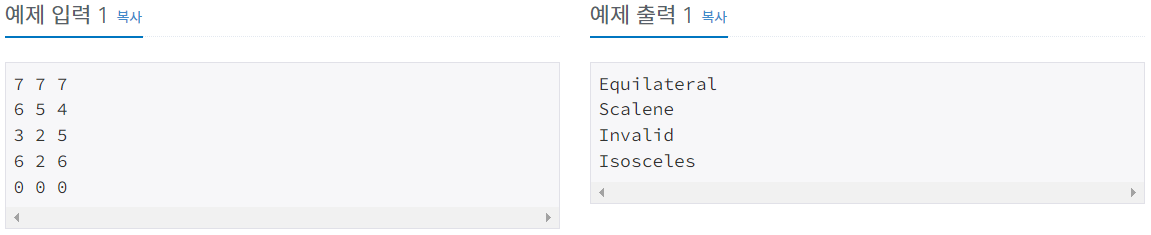 각 입력에 맞는 결과 (Equilateral, Isosceles, Scalene, Invalid) 를 출력하시오.