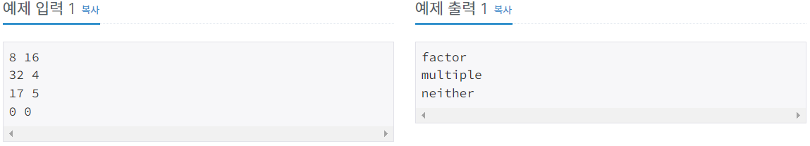 각 테스트 케이스마다 첫 번째 숫자가 두 번째 숫자의 약수라면 factor를, 배수라면 multiple을, 둘 다 아니라면 neither를 출력한다.