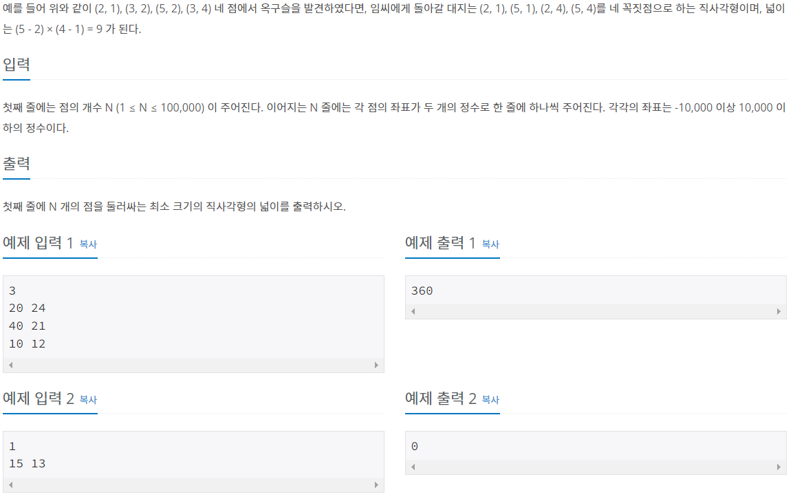 간단하게 생각해야한다. x좌표 제일 큰수에서 작은수를 빼고, y좌표 큰수에서 작은 수를 뺴면 가로 제일 긴 변이 나온다. 그 두 값을 곱하면 최소 크기의 사각형이 나온다.