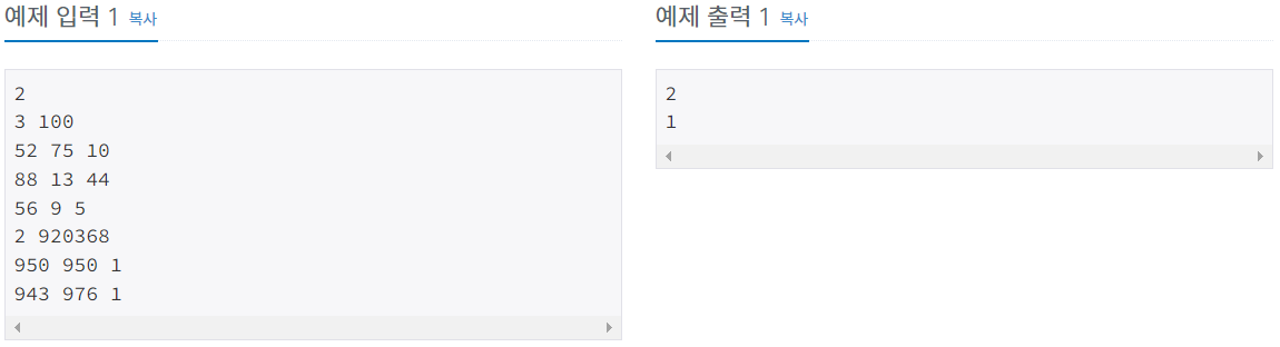 import java.io.BufferedReader; import java.io.IOException; import java.io.InputStreamReader; import java.util.StringTokenizer; public class Main { public static void main(String[] args) throws IOException { BufferedReader br = new BufferedReader(new InputStreamReader(System.in)); int T = Integer.parseInt(br.readLine()); for(int i = 0; i < T; i++) { StringTokenizer st = new StringTokenizer(br.readLine()); int N = Integer.parseInt(st.nextToken()); double P = Double.parseDouble(st.nextToken()); //목적지 도달할 수 있는 우주선의 수를 저장할 변수 int count = 0; for(int j = 0; j < N; j++) { st = new StringTokenizer(br.readLine()); double v = Double.parseDouble(st.nextToken()); double f = Double.parseDouble(st.nextToken()); double c = Double.parseDouble(st.nextToken()); //목적지에 도달할 수 있는 우주선일 경우에 count에 1을 더한다. if((P / v) * c <= f) { count++; } } System.out.println(count); } } }