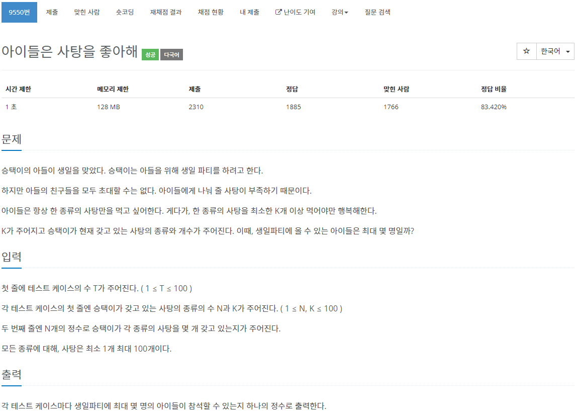 [백준/BOJ] 9550번 : 아이들은 사탕을 좋아해 (JAVA / 자바)백준 2022. 2. 9. 00:02