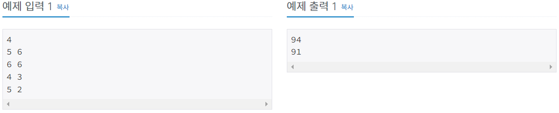 import java.io.BufferedReader; import java.io.IOException; import java.io.InputStreamReader; import java.util.StringTokenizer; public class Main { public static void main(String[] args) throws IOException { BufferedReader br = new BufferedReader(new InputStreamReader(System.in)); int n = Integer.parseInt(br.readLine()); int Acount = 100; int Bcount = 100; for(int i = 0; i < n; i++) { StringTokenizer st = new StringTokenizer(br.readLine()); int A = Integer.parseInt(st.nextToken()); int B = Integer.parseInt(st.nextToken()); if(A > B) { Bcount -= A; }else if(A < B) { Acount -= B; } } System.out.println(Acount + "\n" + Bcount); } }