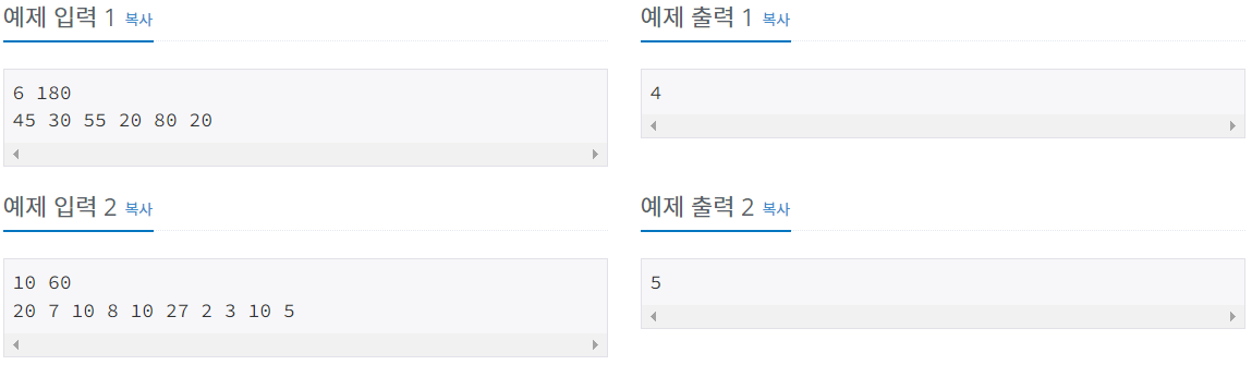 import java.io.BufferedReader; import java.io.IOException; import java.io.InputStreamReader; import java.util.StringTokenizer; public class Main { public static void main(String[] args) throws IOException { BufferedReader br = new BufferedReader(new InputStreamReader(System.in)); StringTokenizer st = new StringTokenizer(br.readLine()); //일의 수 int n = Integer.parseInt(st.nextToken()); //주어진 시간 int T = Integer.parseInt(st.nextToken()); //끝낸 일의 수 int i = 0; st = new StringTokenizer(br.readLine()); for(i = 0; i < n; i++) { //주어진 시간에 입력된 시간을 빼준다. T -= Integer.parseInt(st.nextToken()); //주어진 시간이 다 지나가면 반복문 종료 if(T < 0) { break; } } //끝낸 일의 수를 출력 System.out.println(i); } }