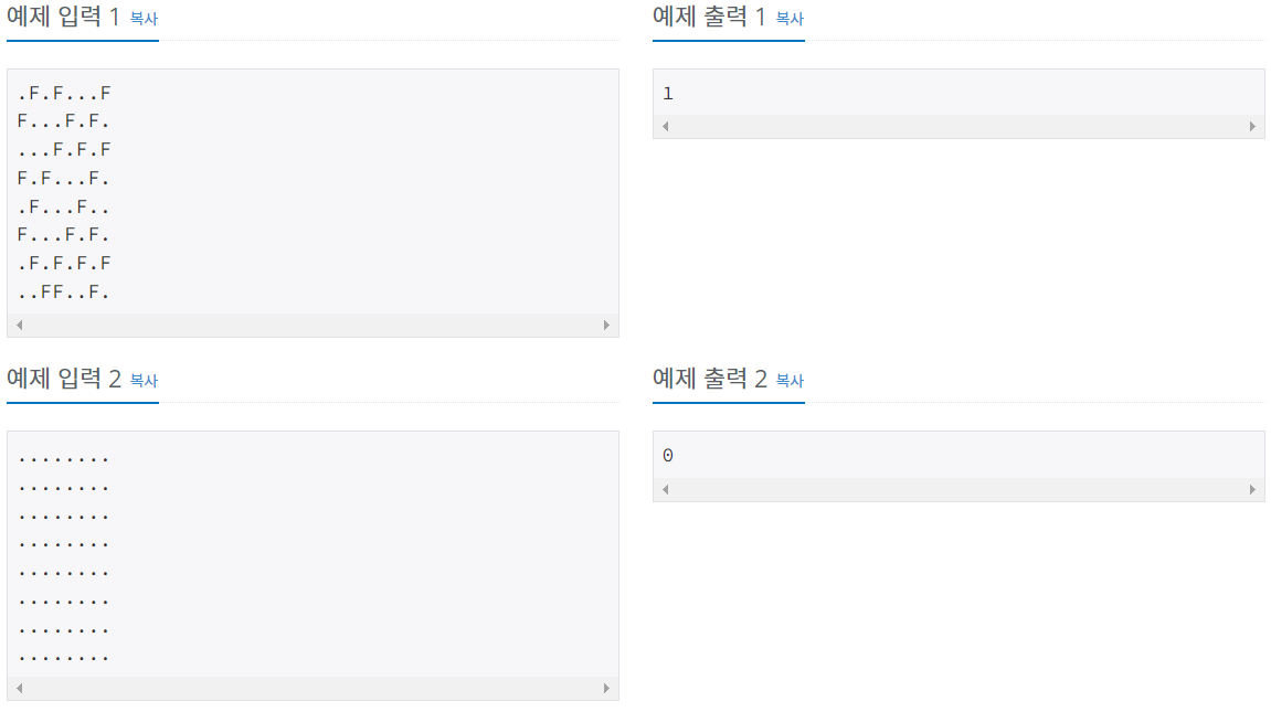 import java.io.BufferedReader; import java.io.IOException; import java.io.InputStreamReader; public class Main { public static void main(String[] args) throws IOException { BufferedReader br = new BufferedReader(new InputStreamReader(System.in)); //하얀칸 위에 말의 수를 저장 할 변수 int result = 0; for(int i = 0; i < 8; i++) { String S = br.readLine(); for(int j = 0; j < 8; j++) { //짝수 짝수 일때 말이 오면 result +1 if(i % 2 == 0) { if(j % 2 == 0) { if(S.charAt(j) == 'F') result++; } //홀수 홀수 일때 말이 오면 result +1 }else { if(j % 2 != 0) { if(S.charAt(j) == 'F') result++; } } } } System.out.println(result); } }
