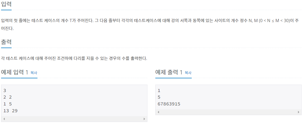 이제 이걸 문제 푸는데 넣어주면 되는데 입력 값을 보면 N M이 입력되면 N이 더 작은 수가 온다. 하지만 조합공식에서는 nCr에서 n이 r보다 커야한다. 그냥 바로 NCM을 해버리면 답이 나오질 않는다. 그러니 잘 생각해서 공식을 짤때 MCN으로 연산이 되게 짜준다.