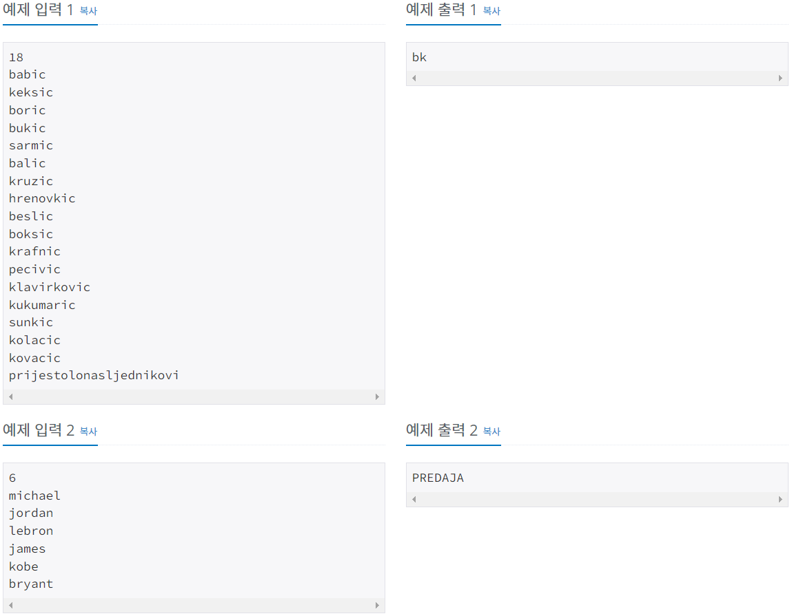 반복문이 끝나고 문자열 배열에 저장된 값이 있으면 문자열을 출력하고, 무자열에 저장된 값이 없다면 "PREDAJA"를 출력한다.