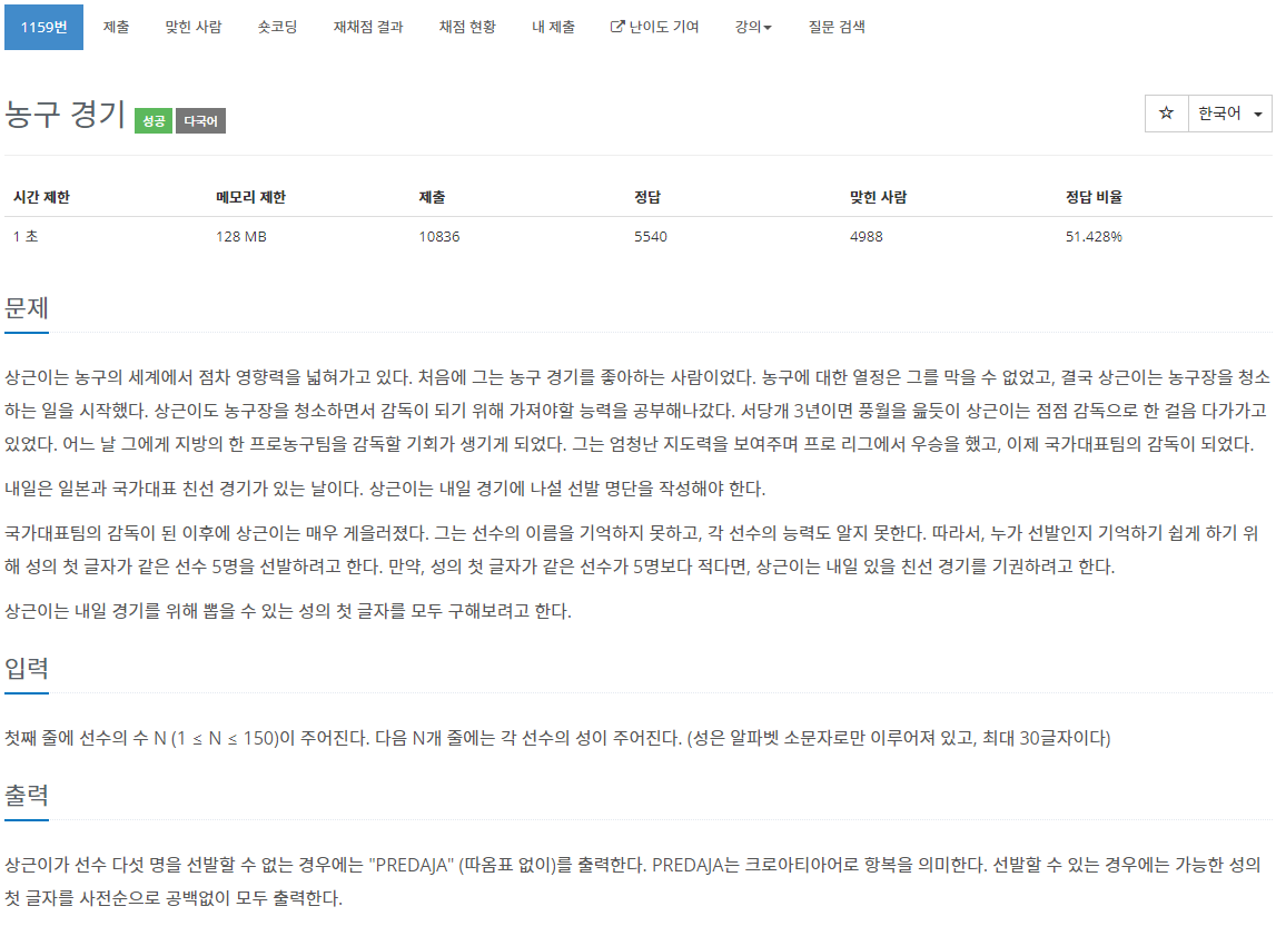 import java.io.BufferedReader; import java.io.IOException; import java.io.InputStreamReader; import java.util.Arrays; public class Main { public static void main(String[] args) throws IOException { BufferedReader br = new BufferedReader(new InputStreamReader(System.in)); int N = Integer.parseInt(br.readLine()); char[] arr = new char[N]; String result = ""; //입력값의 0인덱스 값만 배열에 저장 for(int i = 0; i < N; i++) { arr[i] = (br.readLine()).charAt(0); } //정렬 Arrays.sort(arr); for(int i = 0; i < (N - 1); i++) { int count = 0; for(int j = (i + 1); j < N; j++) { //배열의 값이 같고, 비교 값이 0이 아니면 count에 +1. if(arr[i] == arr[j] && arr[i] != '0') { count++; arr[j] = '0'; } } //5개 이상인데, 비교하게 되면 같은 횟수가 4이면 5개가 같은 것이다. if(count > 3) { result += arr[i]; } } if(result.equals("")) { System.out.println("PREDAJA"); }else { System.out.println(result); } } }