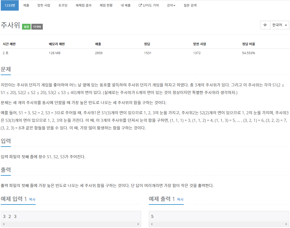 지민이는 주사위 던지기 게임을 좋아하여 어느 날 옆에 있는 동호를 설득하여 주사위 던지기 게임을 하자고 하였다. 총 3개의 주사위가 있다. 그리고 이 주사위는 각각 S1(2 ≤ S1 ≤ 20), S2(2 ≤ S2