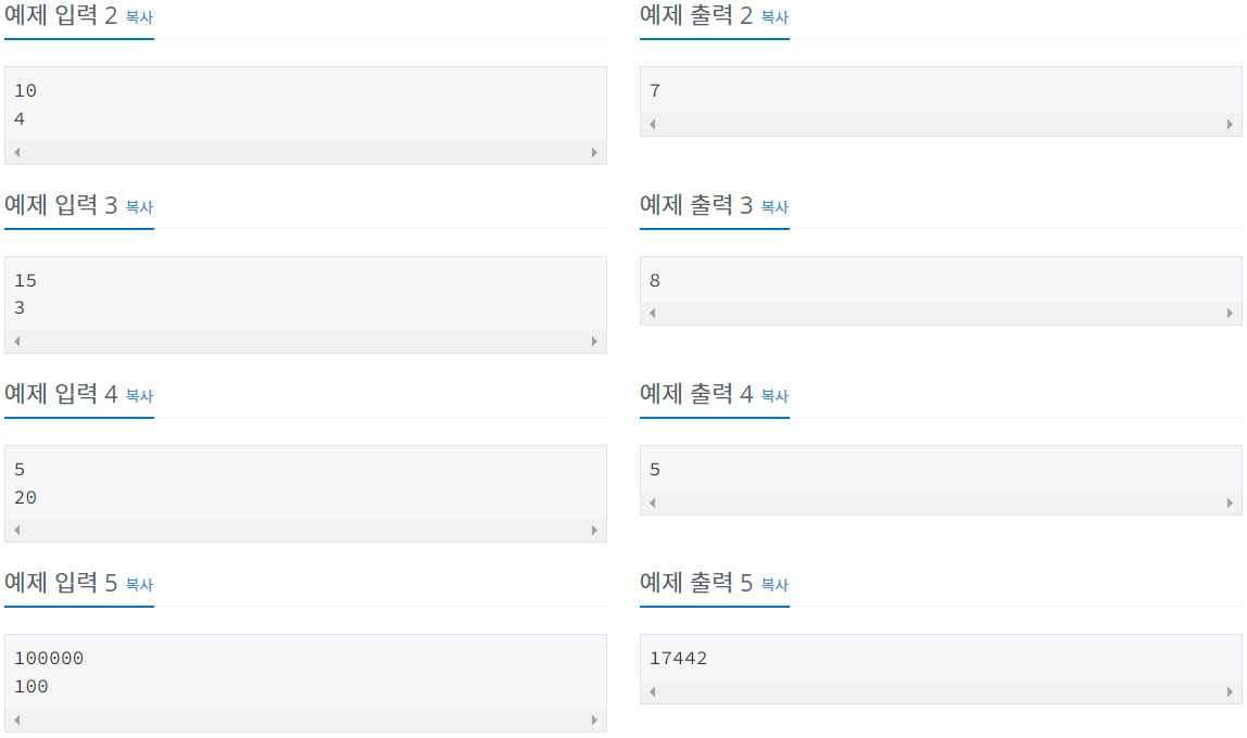 첫째 줄에 N, 둘째 줄에 K가 주어진다. N은 100,000보다 작거나 같은 자연수이고, K는 100보다 작거나 같은 자연수이다.