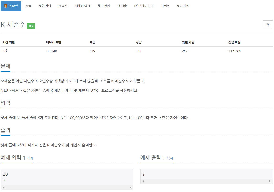 import java.io.BufferedReader; import java.io.IOException; import java.io.InputStreamReader; public class Main { public static void main(String[] args) throws IOException { BufferedReader br = new BufferedReader(new InputStreamReader(System.in)); int N = Integer.parseInt(br.readLine()); int K = Integer.parseInt(br.readLine()); int count = 0; for(int i = 1; i <= N; i++) { int now = i; int max = 0; //현재 나눌 값인 i의 루트 값(Math.sqrt)이하 정수로 연산 for(int j = 2; j <= Math.sqrt(i);) { //나누어떨어진면 같으 값으면 나누어떨어지지 않을때까지 연산 if(now % j == 0) { now /= j; max = j; //나누어떨어지지 않으면 j +1 }else { j++; } } //해당 반복문이 끝나면 최종 값이 1이 아니면 현재 값을 최댓값에 저장 if(now != 1) max = now; //최댓값이 K보다 작거나 같으면 조건에 맞는 값이다. if(max <= K) count++; } System.out.println(count); } }