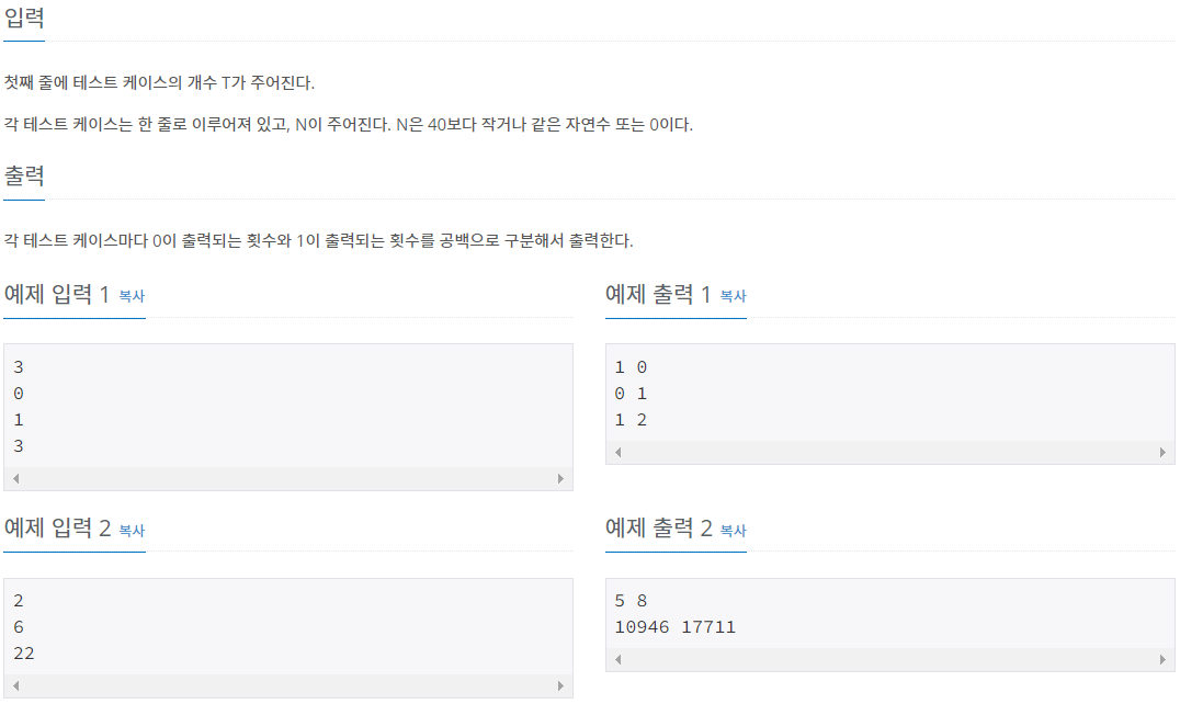 각 테스트 케이스마다 0이 출력되는 횟수와 1이 출력되는 횟수를 공백으로 구분해서 출력한다.