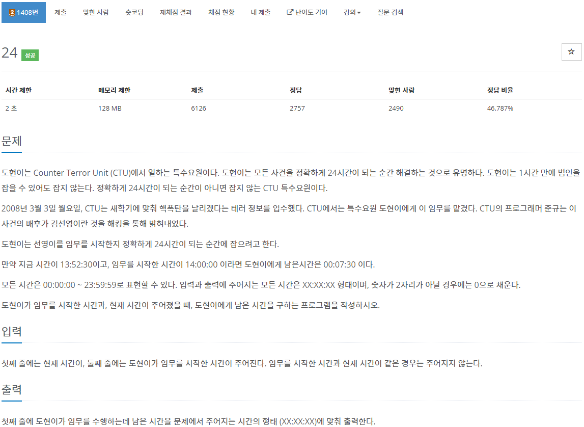 도현이는 Counter Terror Unit (CTU)에서 일하는 특수요원이다. 도현이는 모든 사건을 정확하게 24시간이 되는 순간 해결하는 것으로 유명하다. 도현이는 1시간 만에 범인을 잡을 수 있어도 잡지 않는