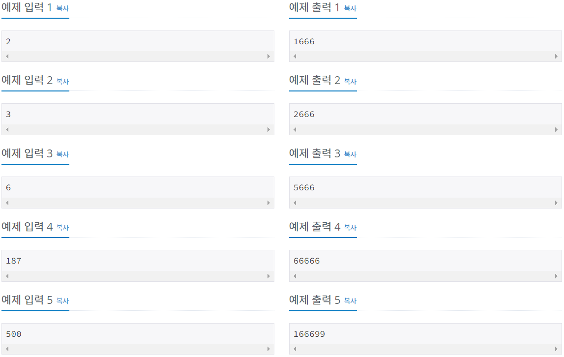 처음에 문제를보고 666부터 1666, 2666 나아간다고?라고 생각해서 그럼 14번째는 14666인가 했지만 예제를 보고 다시 생각해봤다.