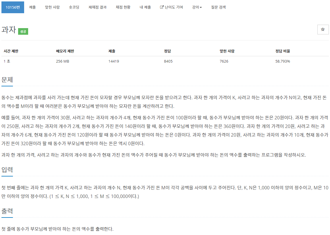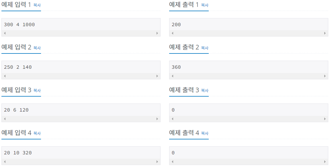 첫 번째 줄에는 과자 한 개의 가격 K, 사려고 하는 과자의 개수 N, 현재 동수가 가진 돈 M이 각각 공백을 사이에 두고 주어진다. 단, K, N은 1,000 이하의 양의 정수이고, M은 10만 이하의 양의 정수이