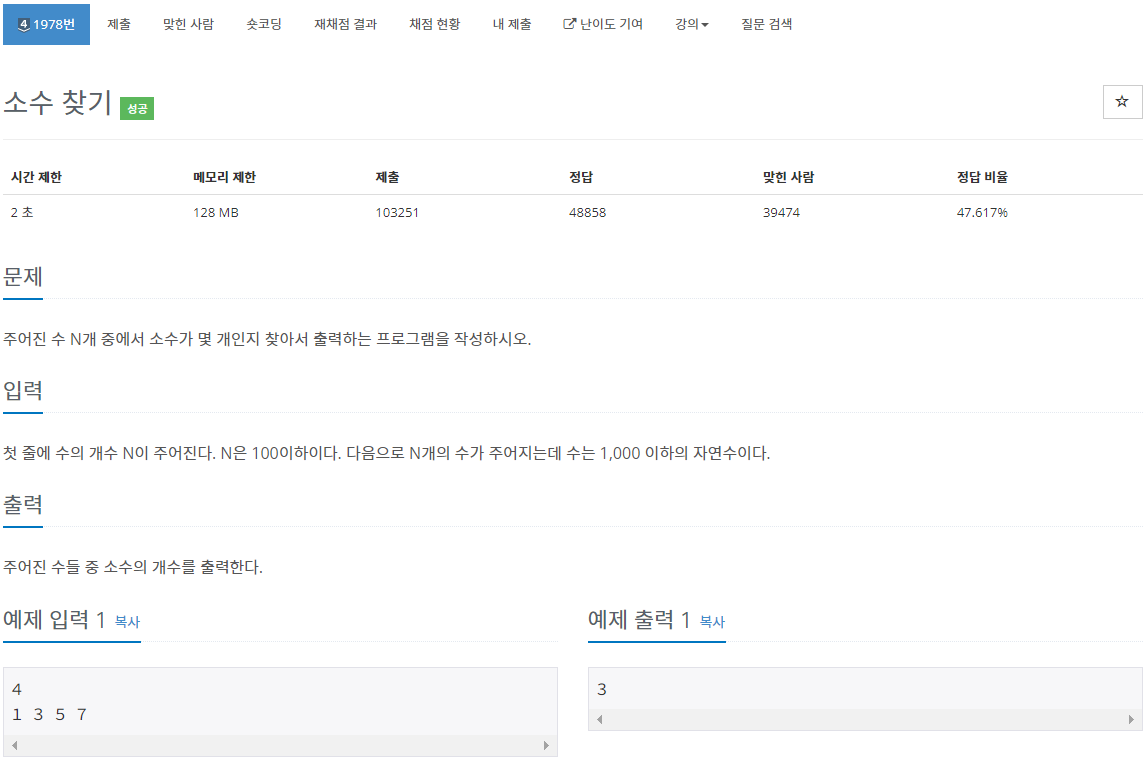 import java.io.BufferedReader; import java.io.IOException; import java.io.InputStreamReader; import java.util.StringTokenizer; public class Main { public static void main(String[] args) throws IOException { BufferedReader br = new BufferedReader(new InputStreamReader(System.in)); int N = Integer.parseInt(br.readLine()); boolean[] arr = new boolean[1001]; //0과 1은 소수가 아니다 arr[0] = true; arr[1] = true; for(int i = 2; i * i <= 1000; i++) { if(!arr[i]) { for(int j = i * i; j <= 1000; j += i) { arr[j] = true; } } } int count = 0; StringTokenizer st = new StringTokenizer(br.readLine()); for(int i = 0; i < N; i++) { int input = Integer.parseInt(st.nextToken()); if(!arr[input]) count++; } System.out.println(count); } }