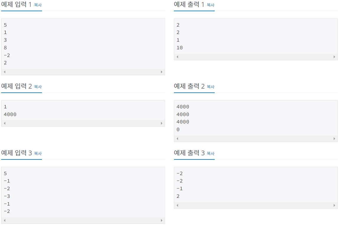 import java.io.BufferedReader; import java.io.IOException; import java.io.InputStreamReader; import java.util.Arrays; public class Main { public static void main(String[] args) throws IOException { BufferedReader br = new BufferedReader(new InputStreamReader(System.in)); int N = Integer.parseInt(br.readLine()); int[] arr = new int[N]; double sum = 0; for(int i = 0; i < N; i++) { arr[i] = Integer.parseInt(br.readLine()); sum += arr[i]; } //정렬 Arrays.sort(arr); int count = 0; int max = -1; //for문 한개로 돌리는 방식이기에 값이 1개이면 반복문이 돌지 않는다. //그렇기에 처음 최빈값은 배열의 첫번째 값으로 저장해 준다. int mod = arr[0]; boolean check = false; //최빈값 구하는 반복문 for(int i = 0; i < N - 1; i++) { if(arr[i] == arr[i + 1]) { count++; }else { count = 0; } if(max < count) { max = count; mod = arr[i]; check = true; }else if(max == count && check == true) { mod = arr[i]; check = false; } } System.out.println(Math.round(sum / N)); System.out.println(arr[(N - 1) / 2]); System.out.println(mod); System.out.println(arr[N - 1] - arr[0]); } }