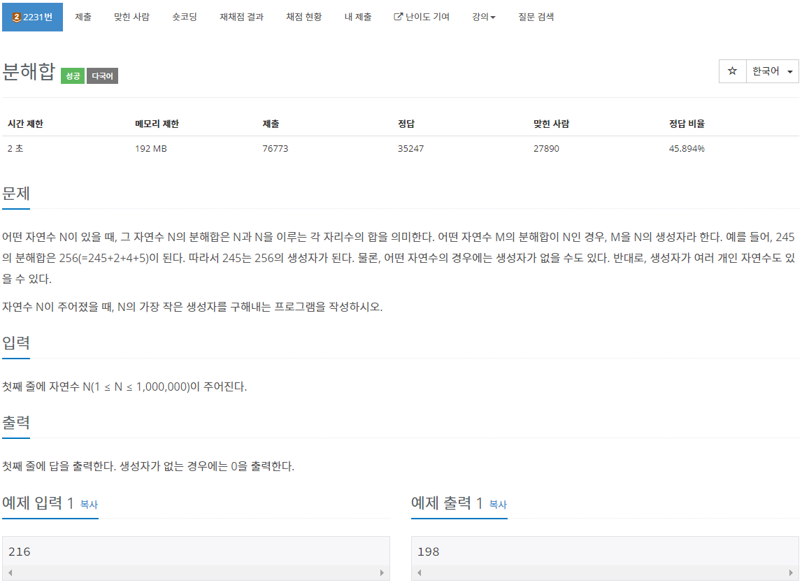 어떤 자연수 N이 있을 때, 그 자연수 N의 분해합은 N과 N을 이루는 각 자리수의 합을 의미한다. 어떤 자연수 M의 분해합이 N인 경우, M을 N의 생성자라 한다. 예를 들어, 245의 분해합은 256(=245+2+4+5)이