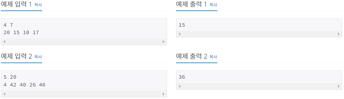 첫째 줄에 나무의 수 N과 상근이가 집으로 가져가려고 하는 나무의 길이 M이 주어진다. (1 ≤ N ≤ 1,000,000, 1 ≤ M ≤ 2,000,000,000) 둘째 줄에는 나무의 높이가 주어진다. 나무의 높이의 합은 항상 M보