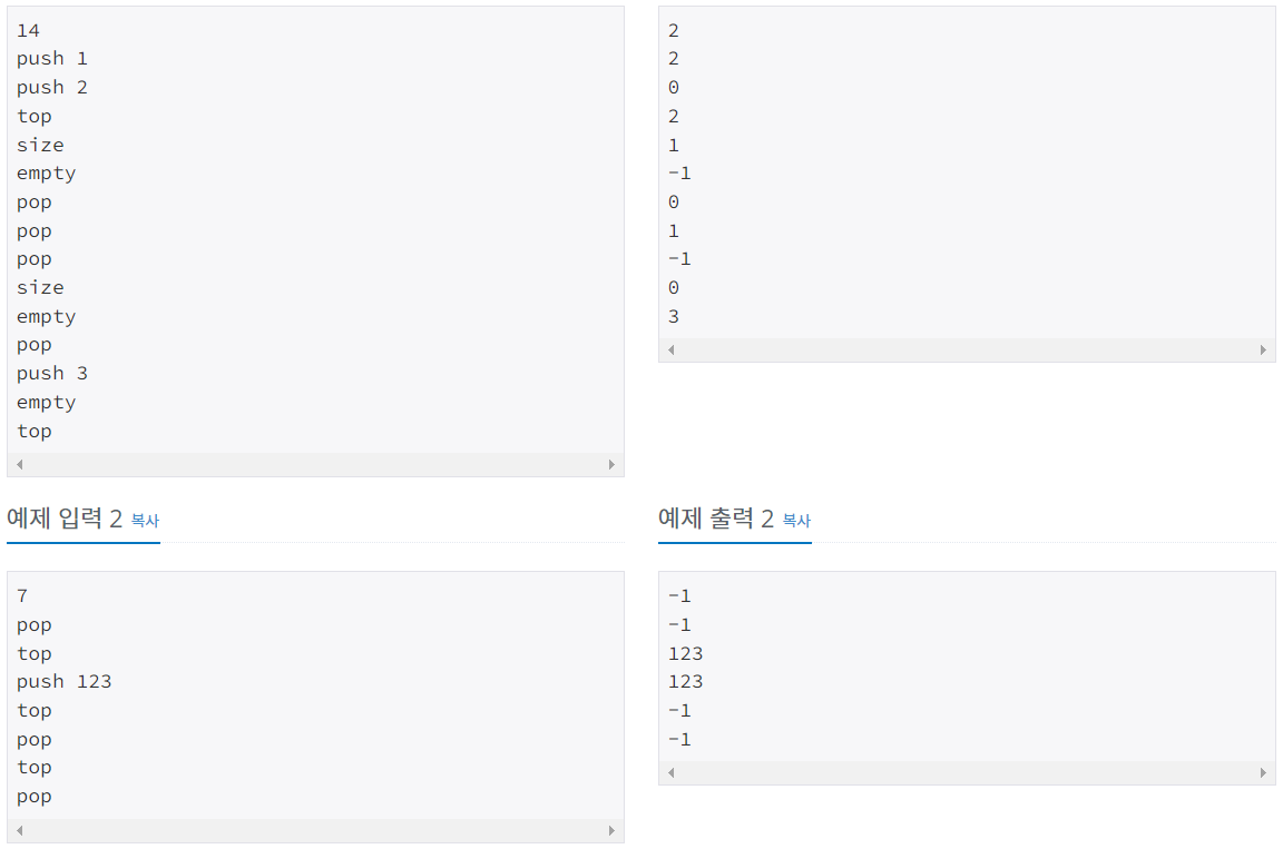 1번에서 그대로 가져다 쓴다곤 했지만, 그정 불러오기만하면 당연 틀린다. 문제를 보면 pop, top이 입력될때 비어 있으면 -1을 출력한다고 한다. 이건 그냥 그대로 쓰면 당연 틀린다. 없을때 pop이나 peek을 하게되면 에러가 나오기 때문이다. 비어있을때의 조건을 추가하자. empty도 그냥 출력하면 0과 1이 나오지만 문제에서 원하는건 반대이다. 비어있을때 1 있을때 0이다.