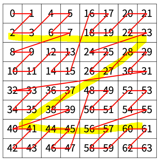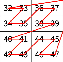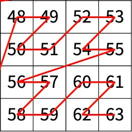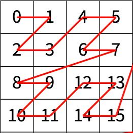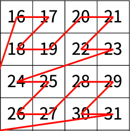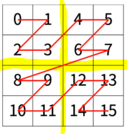 왼쪽 위의 범위는 0~15가 될 것이고, 크기는 4의 제곱이다. 중간값은 (2, 2)가 된다. 3,1는 2,2, 보다 (+, -)이다. 그렇다면 왼쪽 아래에 위치한 것이다.