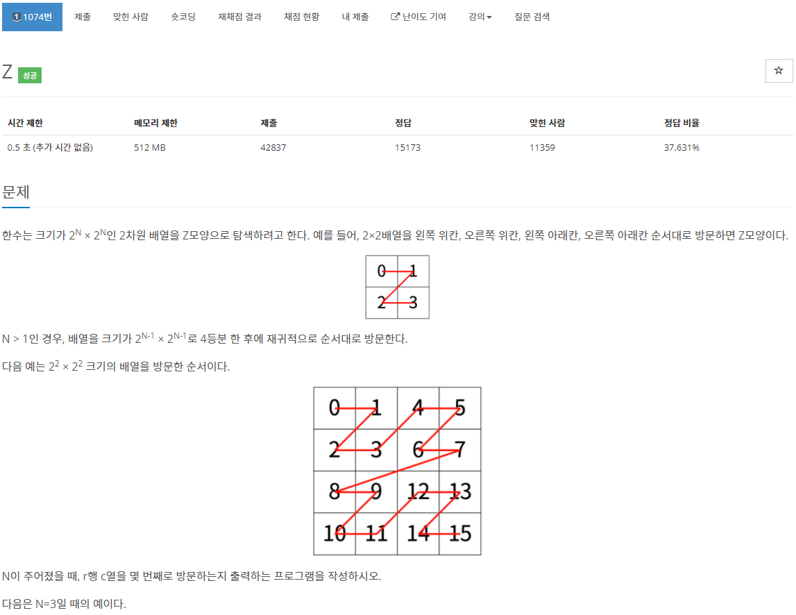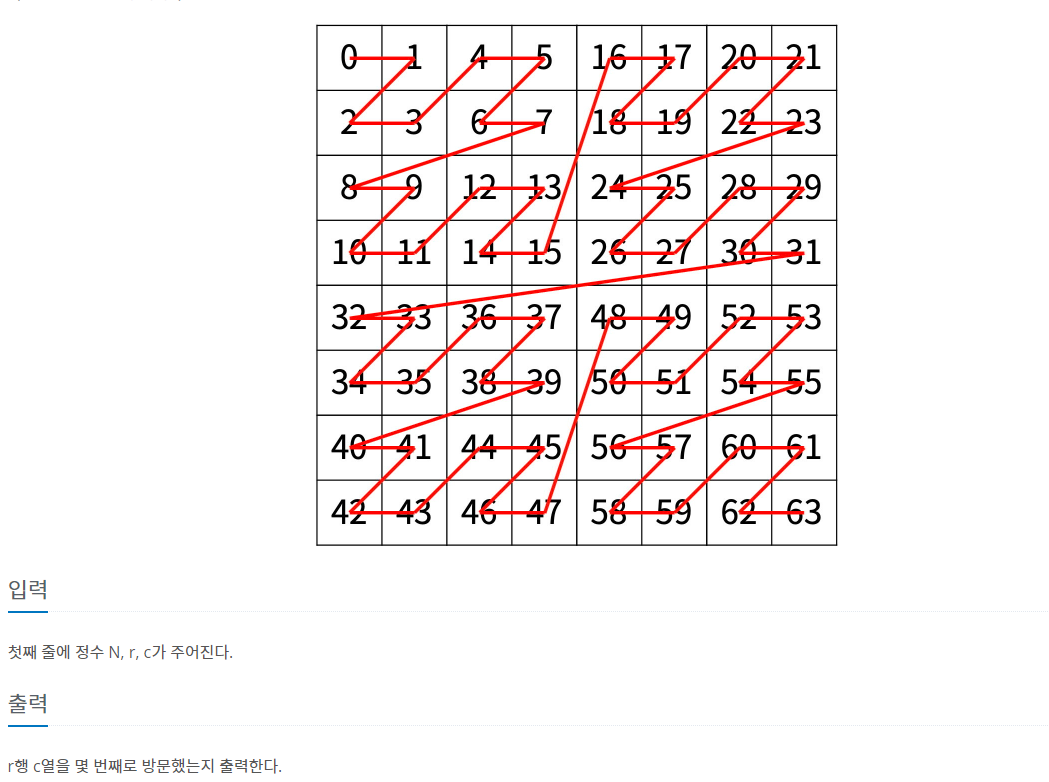 한수는 크기가 2N × 2N인 2차원 배열을 Z모양으로 탐색하려고 한다. 예를 들어, 2×2배열을 왼쪽 위칸, 오른쪽 위칸, 왼쪽 아래칸, 오른쪽 아래칸 순서대로 방문하면 Z모양이다. N > 1인 경우, 배열을