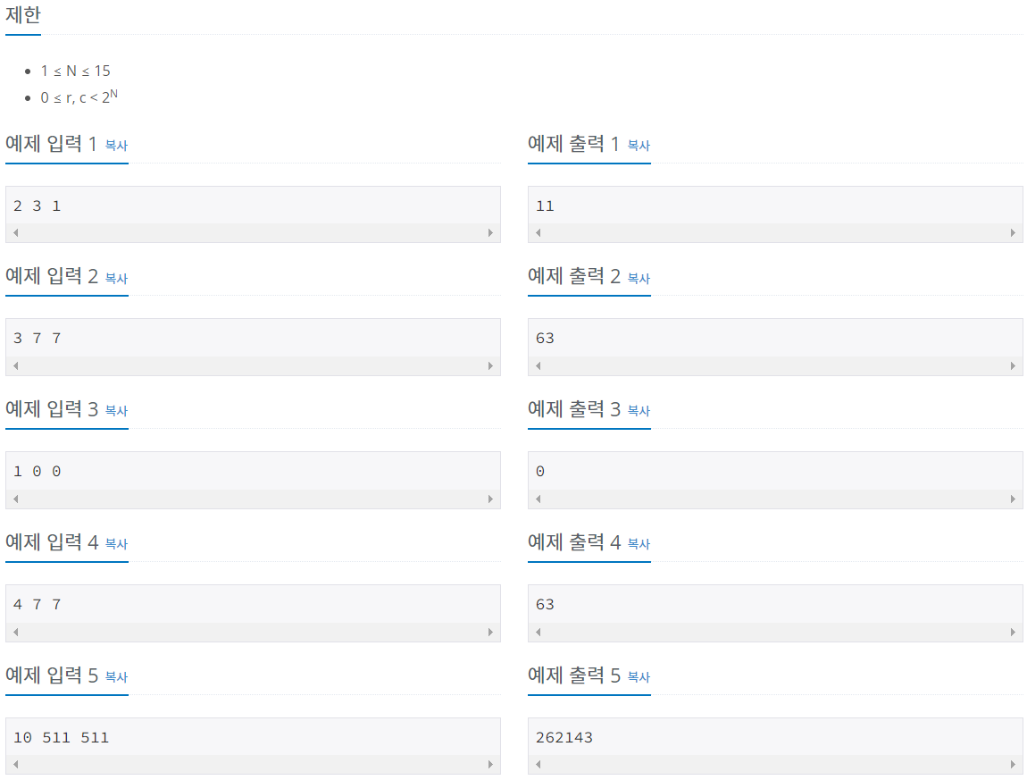 import java.io.BufferedReader; import java.io.IOException; import java.io.InputStreamReader; import java.util.StringTokenizer; public class Main { static int x = 0; static int y = 0; static int count = 0; public static void main(String[] args) throws IOException { BufferedReader br = new BufferedReader(new InputStreamReader(System.in)); StringTokenizer st = new StringTokenizer(br.readLine()); int N = Integer.parseInt(st.nextToken()); int r = Integer.parseInt(st.nextToken()); int c = Integer.parseInt(st.nextToken()); int result = Z((int)Math.pow(2, N), r, c); System.out.println(result); } public static int Z(int n, int r, int c) { //리턴될때마다 칸을 줄여준다. 1이 될때까지 n /= 2; //왼쪽 위에 위치할때 if(r < x + n && c < y + n) { count += (n * n * 0); //오른쪽 위에 위치할때 }else if(r < x + n && c >= y + n) { count += (n * n * 1); y += n; //왼쪽 아래에 위치할때 }else if(c < y + n) { count += (n * n * 2); x += n; //오른쪽 아래에 위치할때 }else { count += (n * n * 3); x += n; y += n; } if(n == 1) return count; return Z(n, r, c); } }