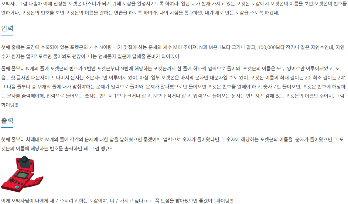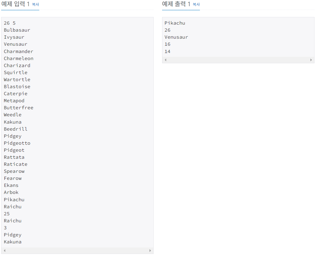 첫째 줄에는 도감에 수록되어 있는 포켓몬의 개수 N이랑 내가 맞춰야 하는 문제의 개수 M이 주어져. N과 M은 1보다 크거나 같고, 100,000보다 작거나 같은 자연수인데, 자연수가 뭔지는 알지? 모르면
