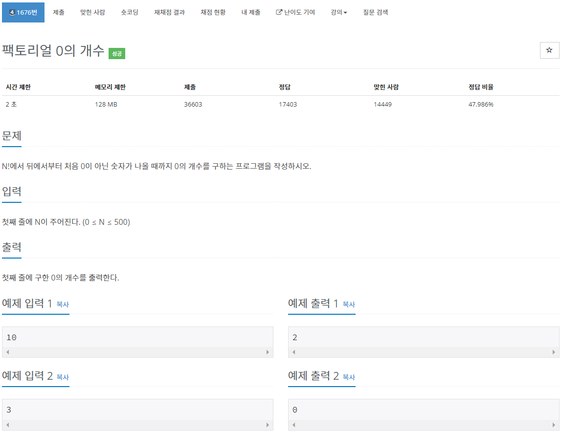 1676번: 팩토리얼 0의 개수