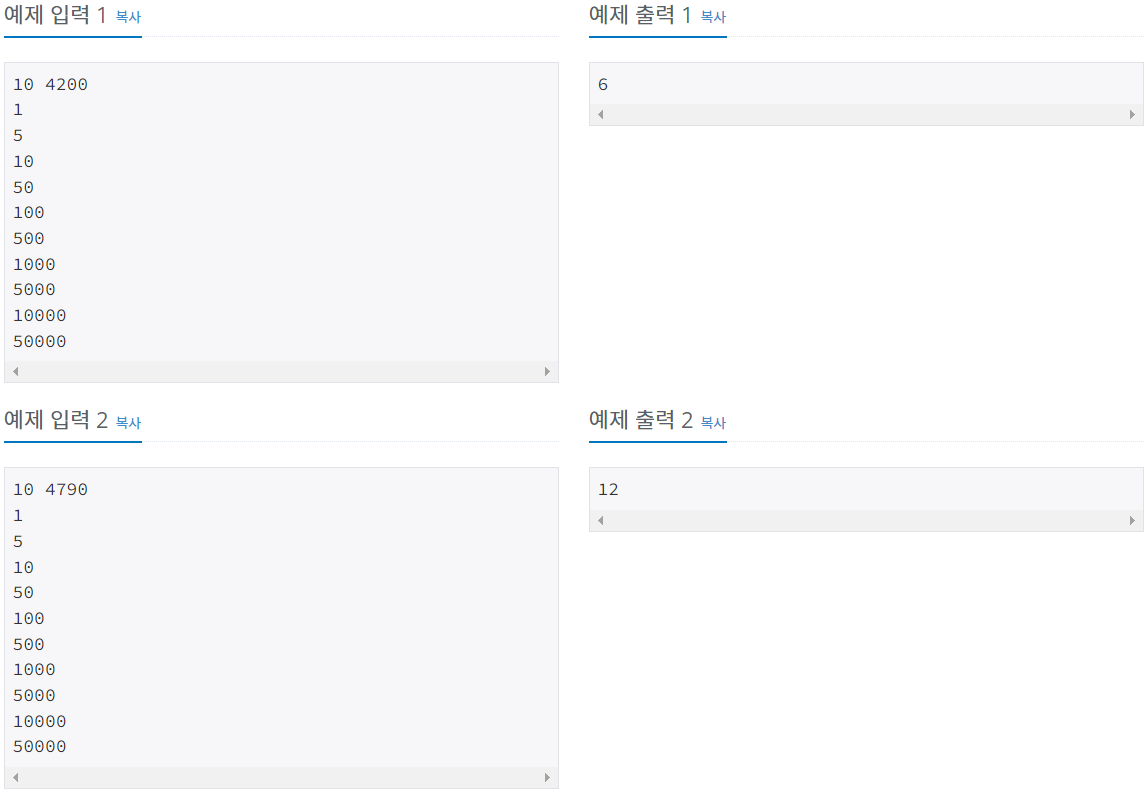 첫째 줄에 N과 K가 주어진다. (1 ≤ N ≤ 10, 1 ≤ K ≤ 100,000,000) 둘째 줄부터 N개의 줄에 동전의 가치 Ai가 오름차순으로 주어진다. (1 ≤ Ai ≤ 1,000,000, A1 = 1, i ≥ 2인 경우에 Ai는 Ai-1의 배수)
