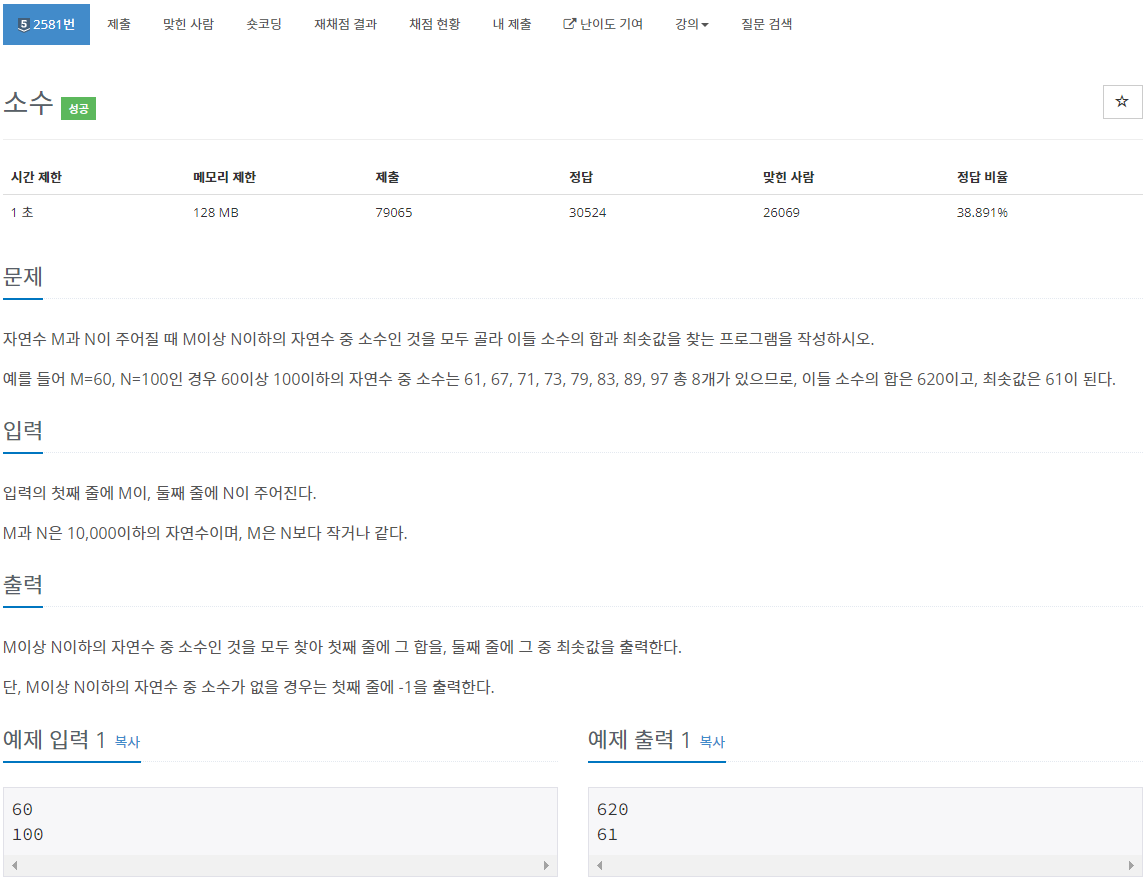 입력된 값 M이상 N 이하의 값들 중 소수를 구해서 최솟값과 합을 구해야한다.