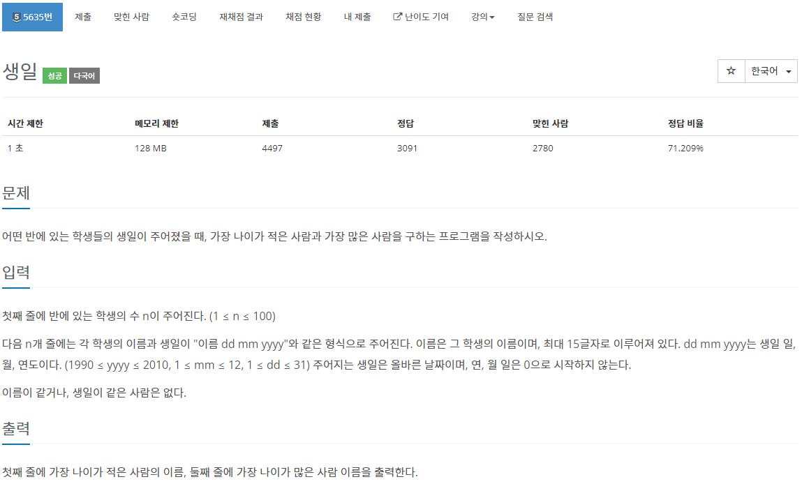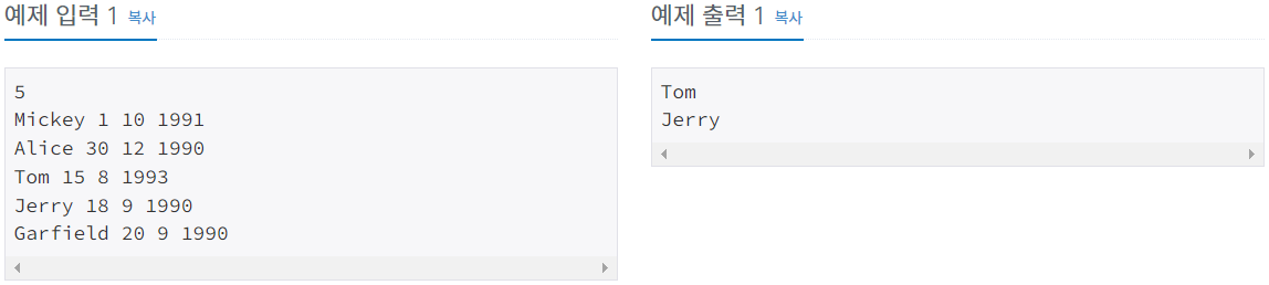 오름차순으로 정렬했고, 나이는 연도, 월, 일 값이 작은 사람이 더 나이가 많기때문에 그걸 생각하고 출력값 지정을 잘 해주자.