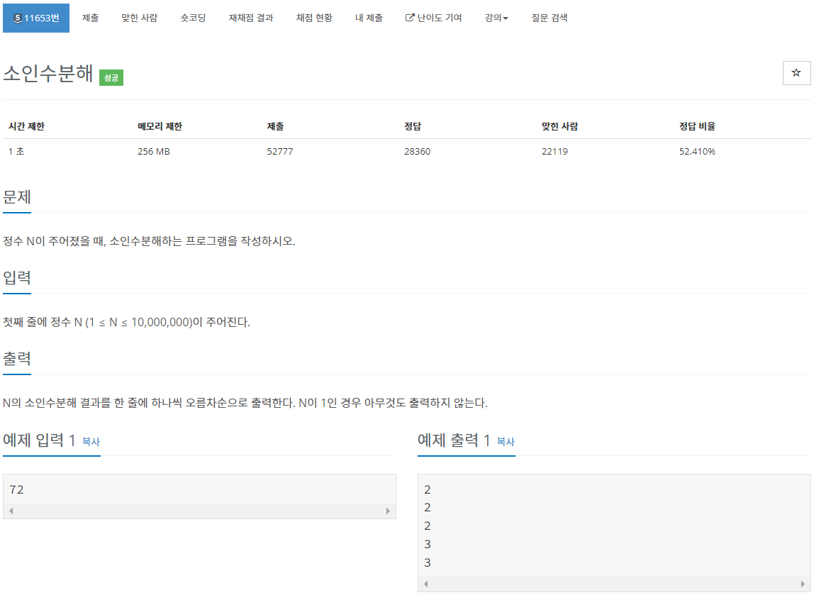 예제 1을 보면 72이다. 2로 먼저 나누어보자. 나누어 떨어진다. 그럼 72 / 2 = 36이 된다. 다음 36을 본다. 2로 나누어 떨어지니 36 / 2 = 18이 된다. 18도 2로 나누어 떨어지니 18 / 2 = 9가 된다. 9는 2로 나누어떨어지지 않으니 2+1 해서 3을 본다. 9는 3으로 나누어 떨어지니 9 / 3 = 3이 된다. 3도 3으로 나누어 떨어지니 3 / 3 = 1이 된다. 입력된 값이 1이 되었으니 반복을 종료하고, 나눈 값들을 출력하자. 2, 2, 2, 3, 3으로 나누었으니 해당 값들이 출력 값이 되는 것이다.