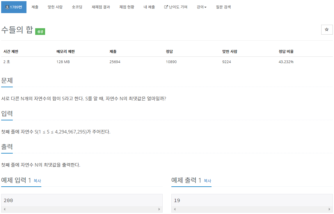 200을 만들기위한 서로 다른 자연수들의 합에서 자연수들의 개수가 최대가 되기 위해선 위에서 말한 것처럼 1부터 빼주자.