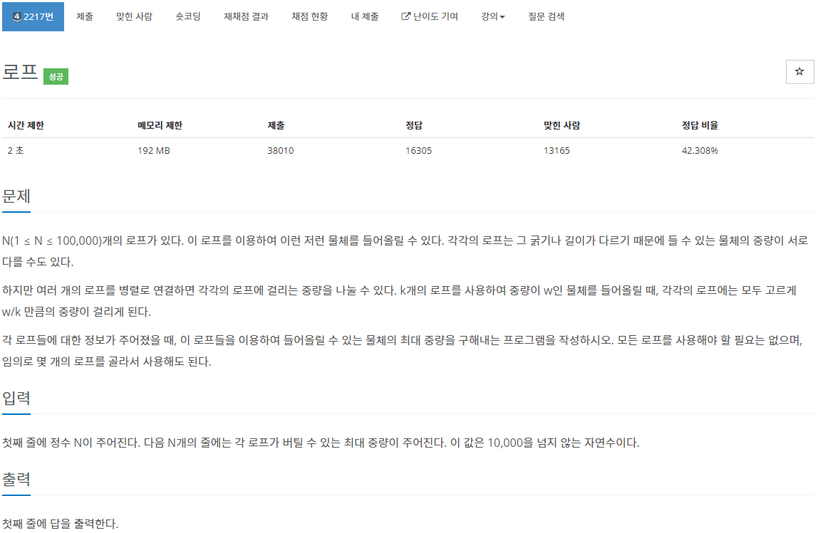 N(1 ≤ N ≤ 100,000)개의 로프가 있다. 이 로프를 이용하여 이런 저런 물체를 들어올릴 수 있다. 각각의 로프는 그 굵기나 길이가 다르기 때문에 들 수 있는 물체의 중량이 서로 다를 수도 있다. 하