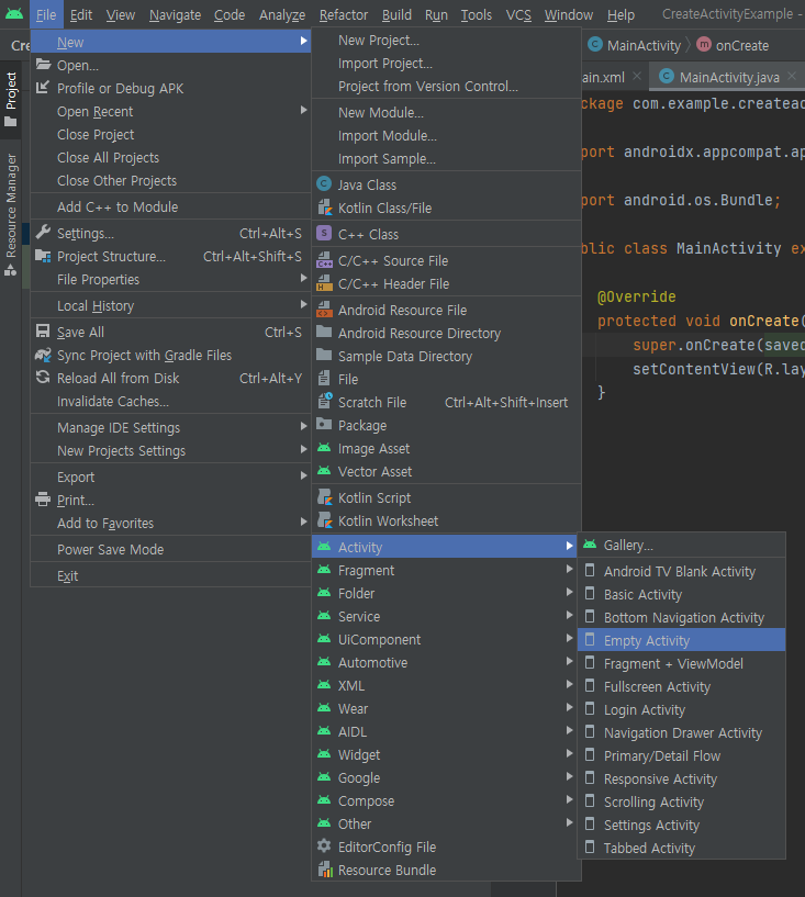 File -> New -> Activity -> 생성하고 싶은 Activity 형태(대체로 Empty Activity)