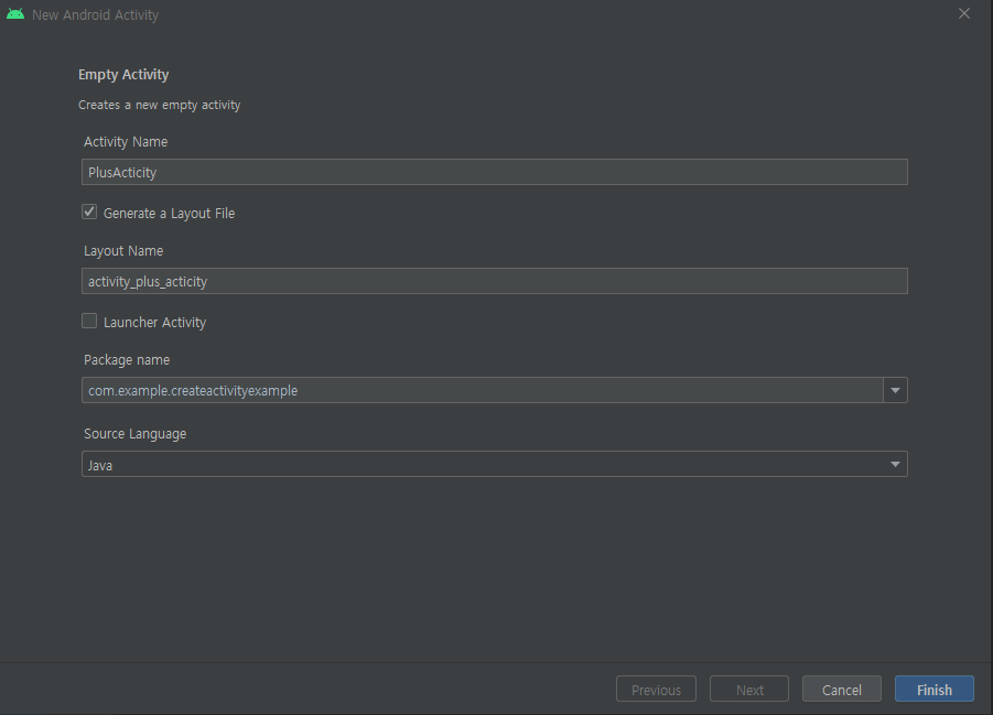 Activity Name에 원하는 이름을 적어 넣고, finish를 클릭하면 해당 이름을 가지는 class와 xml이 나온다.
