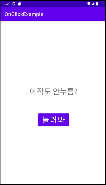 package com.example.onclickexample; import androidx.appcompat.app.AppCompatActivity; import android.os.Bundle; import android.view.View; import android.widget.Button; import android.widget.TextView; public class MainActivity extends AppCompatActivity { @Override protected void onCreate(Bundle savedInstanceState) { super.onCreate(savedInstanceState); setContentView(R.layout.activity_main); TextView textView = findViewById(R.id.textView); Button button = findViewById(R.id.button); button.setOnClickListener(new View.OnClickListener() { @Override public void onClick(View view) { textView.setText("눌렀네?"); } }); } }필자는 버튼을 눌렀을때, 텍스트 뷰에 값이 "눌렀네?"로 바뀌게 코드를 짰다.