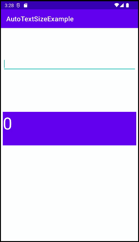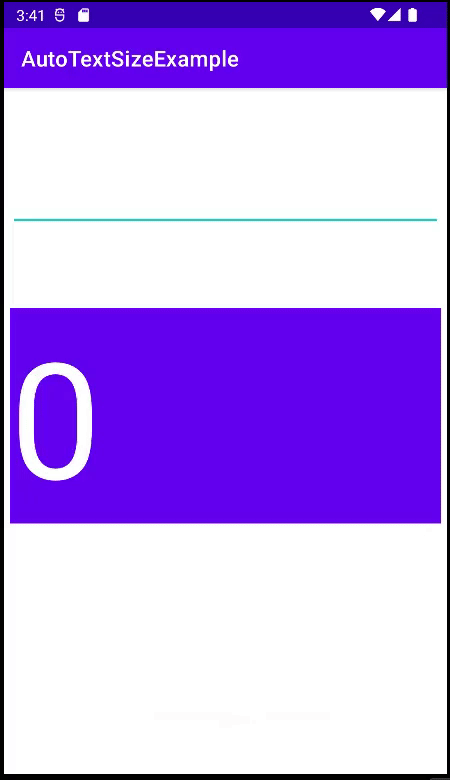 <?xml version="1.0" encoding="utf-8"?> <androidx.constraintlayout.widget.ConstraintLayout xmlns:android="http://schemas.android.com/apk/res/android" xmlns:app="http://schemas.android.com/apk/res-auto" xmlns:tools="http://schemas.android.com/tools" android:layout_width="match_parent" android:layout_height="match_parent" tools:context=".MainActivity"> <TextView android:id="@+id/TextView" android:layout_width="400dp" android:layout_height="200dp" android:background="@color/purple_500" android:textColor="@color/white" android:text="0" android:autoSizeTextType="uniform" android:autoSizeMaxTextSize="200sp" android:autoSizeMinTextSize="12sp" android:autoSizeStepGranularity="2sp" app:layout_constraintBottom_toBottomOf="parent" app:layout_constraintLeft_toLeftOf="parent" app:layout_constraintRight_toRightOf="parent" app:layout_constraintTop_toTopOf="parent" app:layout_constraintVertical_bias="0.467" /> </androidx.constraintlayout.widget.ConstraintLayout>android:autoSizeTextType="uniform" android:autoSizeMaxTextSize="200sp" android:autoSizeMinTextSize="12sp" android:autoSizeStepGranularity="2sp"필자는 최대 200sp, 최소 12sp, 변화 크기 2sp로 설정했다.