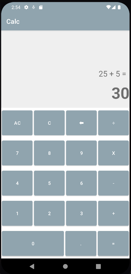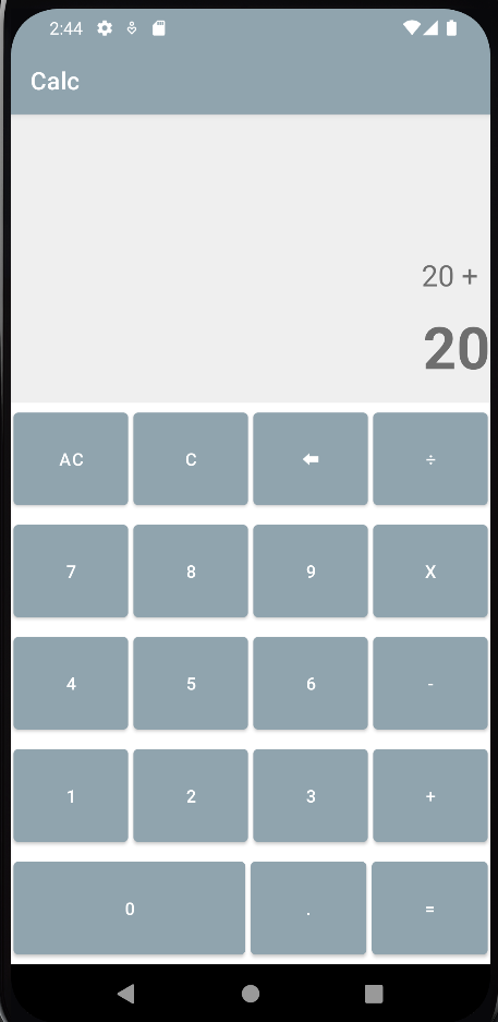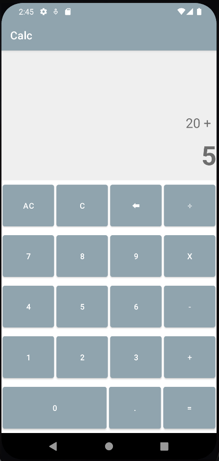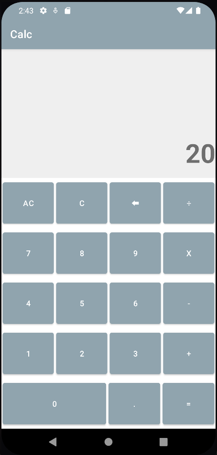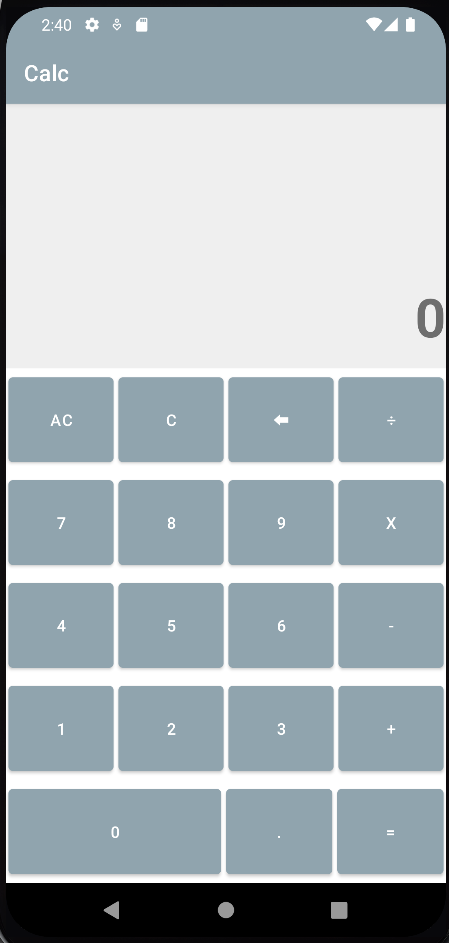 <?xml version="1.0" encoding="utf-8"?> <LinearLayout xmlns:android="http://schemas.android.com/apk/res/android" xmlns:app="http://schemas.android.com/apk/res-auto" xmlns:tools="http://schemas.android.com/tools" android:layout_width="match_parent" android:layout_height="match_parent" android:orientation="vertical" tools:context=".MainActivity"> <TextView android:id="@+id/tvIntput" android:layout_width="match_parent" android:layout_height="0dp" android:layout_weight="4" android:background="@color/light_grey" android:padding="10dp" android:textSize="24sp" android:gravity="end|bottom"/> <TextView android:id="@+id/tvResult" android:layout_width="match_parent" android:layout_height="0dp" android:layout_weight="2" android:background="@color/light_grey" android:textSize="48sp" android:textStyle="bold" android:hint="0" android:gravity="end"/> <LinearLayout android:layout_width="match_parent" android:layout_height="wrap_content" android:orientation="horizontal" android:layout_weight="1"> <Button android:layout_margin="2dp" android:id="@+id/btnAllCRL" android:layout_width="0dp" android:layout_height="match_parent" android:layout_weight="1" android:onClick="ACClick" android:text="AC"/> <Button android:layout_margin="2dp" android:id="@+id/btnCRL" android:layout_width="0dp" android:layout_height="match_parent" android:layout_weight="1" android:onClick="ClearClick" android:text="C"/> <Button android:layout_margin="2dp" android:id="@+id/btnBack" android:layout_width="0dp" android:layout_height="match_parent" android:layout_weight="1" android:onClick="BackClick" android:text="⬅"/> <Button android:layout_margin="2dp" android:id="@+id/btnDivide" android:layout_width="0dp" android:layout_height="match_parent" android:layout_weight="1" android:onClick="OperClick" android:text="÷"/> </LinearLayout> <LinearLayout android:layout_width="match_parent" android:layout_height="wrap_content" android:orientation="horizontal" android:layout_weight="1"> <Button android:layout_margin="2dp" android:id="@+id/btnSeven" android:layout_width="0dp" android:layout_height="match_parent" android:layout_weight="1" android:onClick="numClick" android:text="7"/> <Button android:layout_margin="2dp" android:id="@+id/btnEight" android:layout_width="0dp" android:layout_height="match_parent" android:layout_weight="1" android:onClick="numClick" android:text="8"/> <Button android:layout_margin="2dp" android:id="@+id/btnNine" android:layout_width="0dp" android:layout_height="match_parent" android:layout_weight="1" android:onClick="numClick" android:text="9"/> <Button android:layout_margin="2dp" android:id="@+id/btnMultiply" android:layout_width="0dp" android:layout_height="match_parent" android:layout_weight="1" android:onClick="OperClick" android:text="x"/> </LinearLayout> <LinearLayout android:layout_width="match_parent" android:layout_height="wrap_content" android:orientation="horizontal" android:layout_weight="1"> <Button android:layout_margin="2dp" android:id="@+id/btnFour" android:layout_width="0dp" android:layout_height="match_parent" android:layout_weight="1" android:onClick="numClick" android:text="4"/> <Button android:layout_margin="2dp" android:id="@+id/btnFive" android:layout_width="0dp" android:layout_height="match_parent" android:layout_weight="1" android:onClick="numClick" android:text="5"/> <Button android:layout_margin="2dp" android:id="@+id/btnSix" android:layout_width="0dp" android:layout_height="match_parent" android:layout_weight="1" android:onClick="numClick" android:text="6"/> <Button android:layout_margin="2dp" android:id="@+id/btnSubtract" android:layout_width="0dp" android:layout_height="match_parent" android:layout_weight="1" android:onClick="OperClick" android:text="-"/> </LinearLayout> <LinearLayout android:layout_width="match_parent" android:layout_height="wrap_content" android:orientation="horizontal" android:layout_weight="1"> <Button android:layout_margin="2dp" android:id="@+id/btnOne" android:layout_width="0dp" android:layout_height="match_parent" android:layout_weight="1" android:onClick="numClick" android:text="1"/> <Button android:layout_margin="2dp" android:id="@+id/btnTwo" android:layout_width="0dp" android:layout_height="match_parent" android:layout_weight="1" android:onClick="numClick" android:text="2"/> <Button android:layout_margin="2dp" android:id="@+id/btnThree" android:layout_width="0dp" android:layout_height="match_parent" android:layout_weight="1" android:onClick="numClick" android:text="3"/> <Button android:layout_margin="2dp" android:id="@+id/btnPlus" android:layout_width="0dp" android:layout_height="match_parent" android:layout_weight="1" android:onClick="OperClick" android:text="+"/> </LinearLayout> <LinearLayout android:layout_width="match_parent" android:layout_height="wrap_content" android:layout_weight="1" android:orientation="horizontal"> <Button android:id="@+id/btnZero" android:layout_width="0dp" android:layout_height="match_parent" android:layout_margin="2dp" android:layout_weight="2" android:onClick="numClick" android:text="0" /> <Button android:id="@+id/btnDot" android:layout_width="0dp" android:layout_height="match_parent" android:layout_margin="2dp" android:layout_weight="1" android:onClick="DotClick" android:text="." /> <Button android:id="@+id/btnEqual" android:layout_width="0dp" android:layout_height="match_parent" android:layout_margin="2dp" android:layout_weight="1" android:onClick="EqualClick" android:text="=" /> </LinearLayout> </LinearLayout>선형레이아웃을 사용해 UI를 배치했고, onClick으로 코틀린 파일에서 작성한 클릭 이벤트를 실행시켰다.
