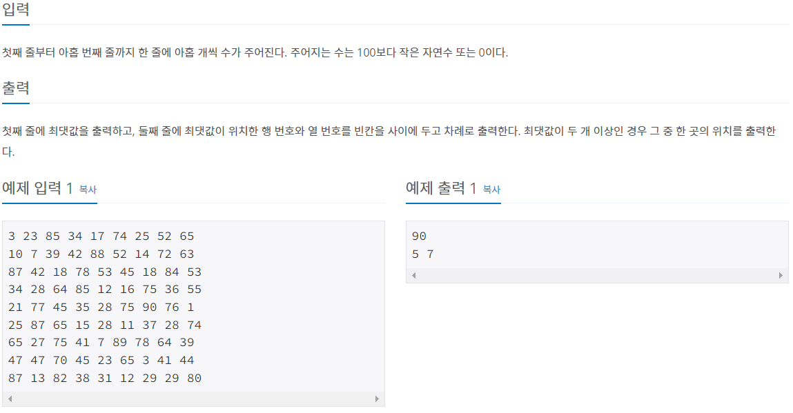 행과 열을 담당할 for문을 만들고, 1행부터 1열부터 가로 즉 1행을 먼저 완성하고 다음 행으로 넘어가는 식의 입력값을 받는다. 입력값이 들어가면서 최댓값을 비교하고 입력값이 현재 최댓값일때 최댓값을 해당 변수에 저장하고, 만들어둔 문자열에 행 번호와 열 번호를 문자열로 형변환해서 사이에 공백을 하나 추가해서 저장한다.