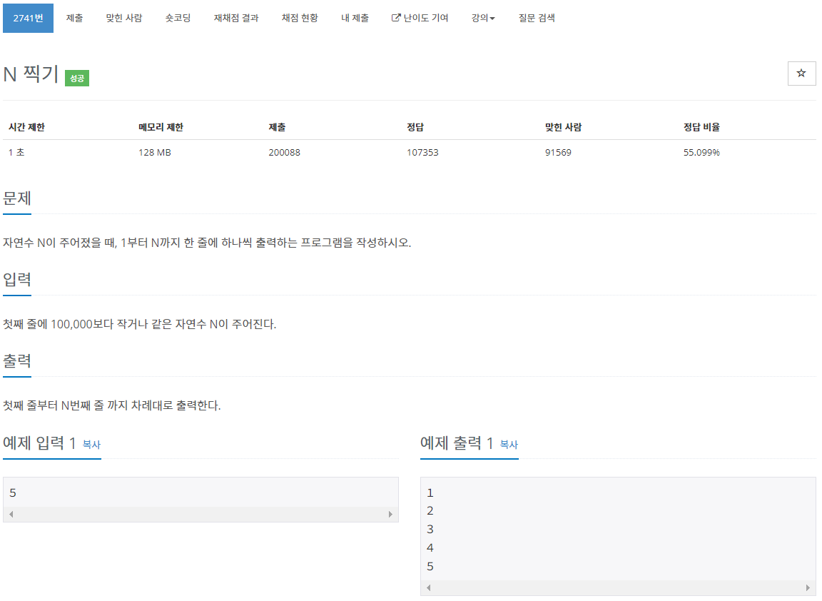 자연수 N이 주어졌을 때, 1부터 N까지 한 줄에 하나씩 출력하는 프로그램을 작성하시오.