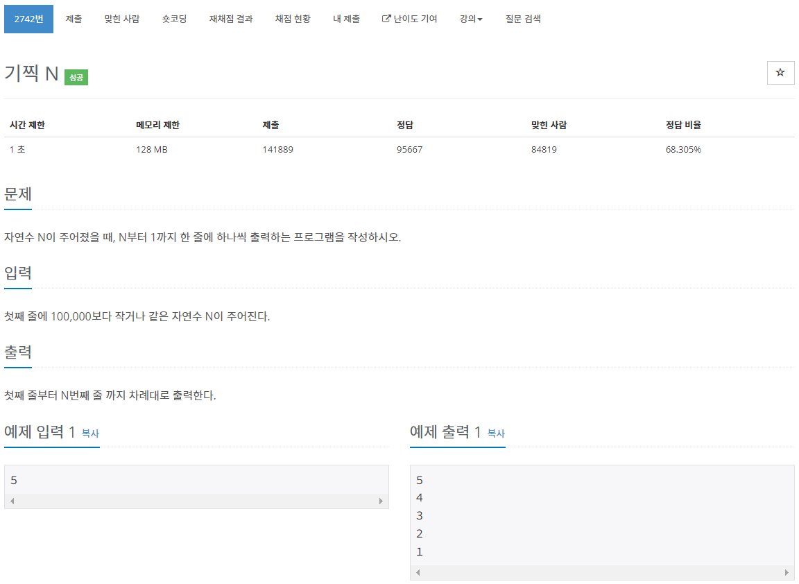 자연수 N이 주어졌을 때, N부터 1까지 한 줄에 하나씩 출력하는 프로그램을 작성하시오.