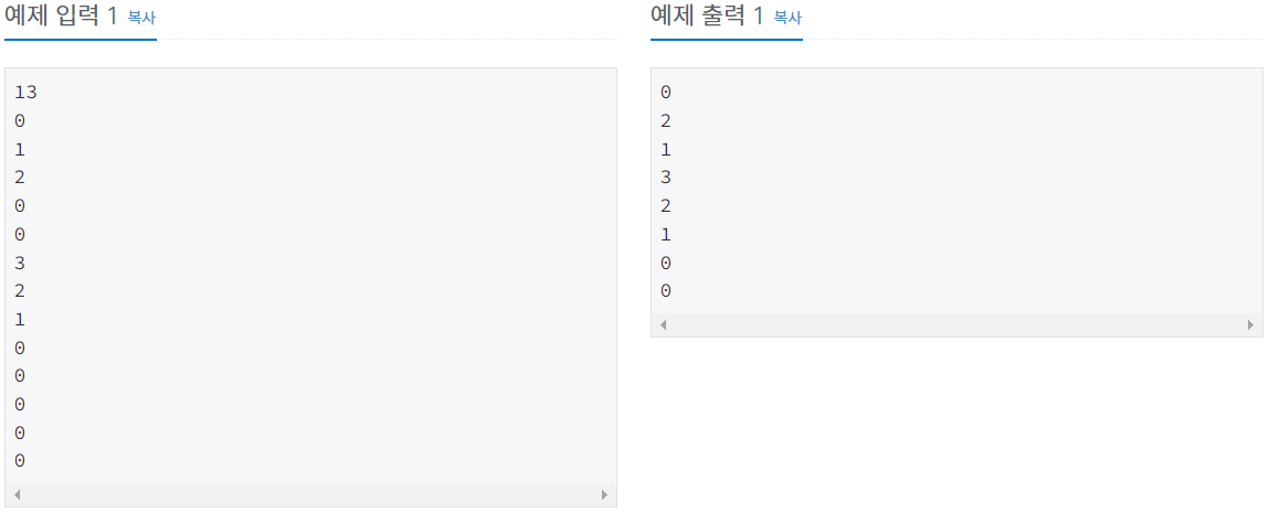첫째 줄에 연산의 개수 N(1 ≤ N ≤ 100,000)이 주어진다. 다음 N개의 줄에는 연산에 대한 정보를 나타내는 정수 x가 주어진다. 만약 x가 자연수라면 배열에 x라는 값을 넣는(추가하는) 연산이고, x가
