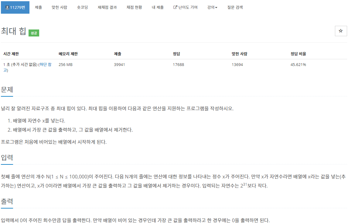 11279번: 최대 힙