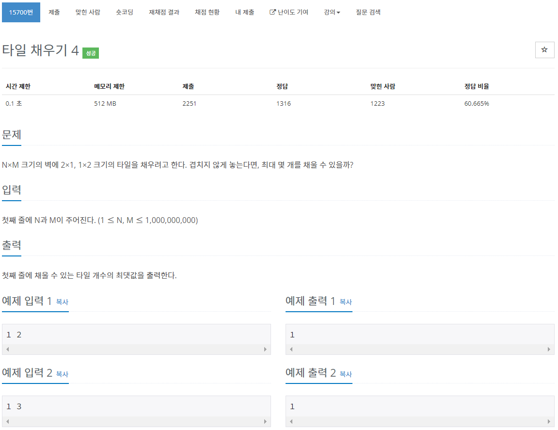 [백준/BOJ] 15700번 : 타일 채우기 4 (JAVA / 자바)